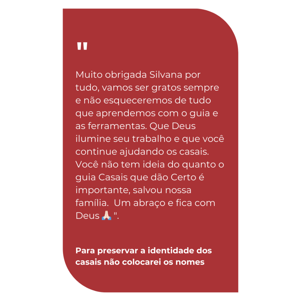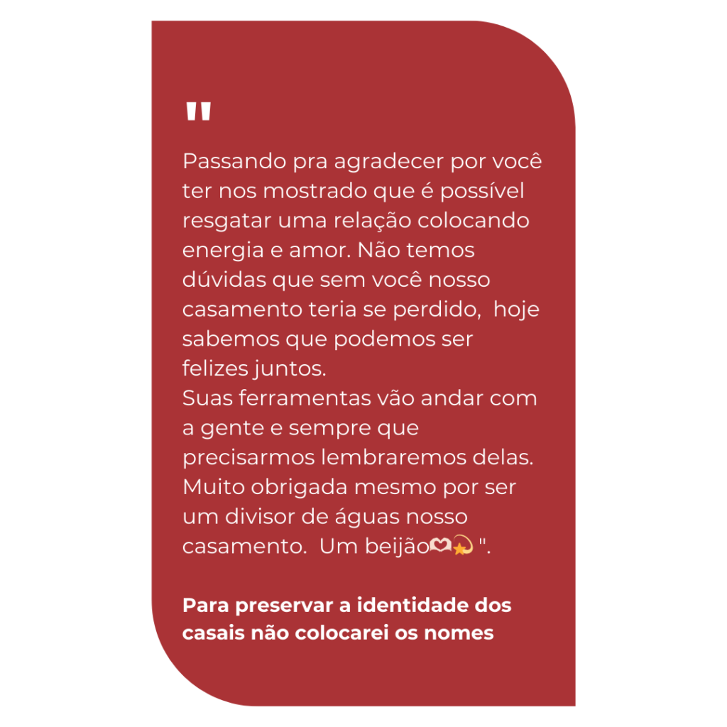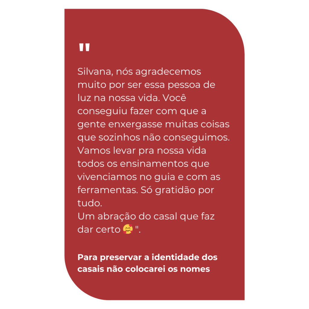 Em todos estes anos atendendo tanto no individual quanto casais não houve sequer um caso em que o paciente aplicou o guia e não obteve resultado. Com certeza após passar pelo Guia para aprender a se comunicar com o seu parceiro/a você terá um relacionamento muito mais leve, saudável e feliz!